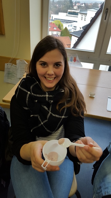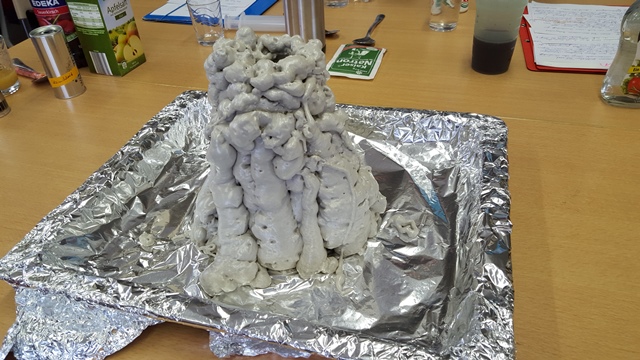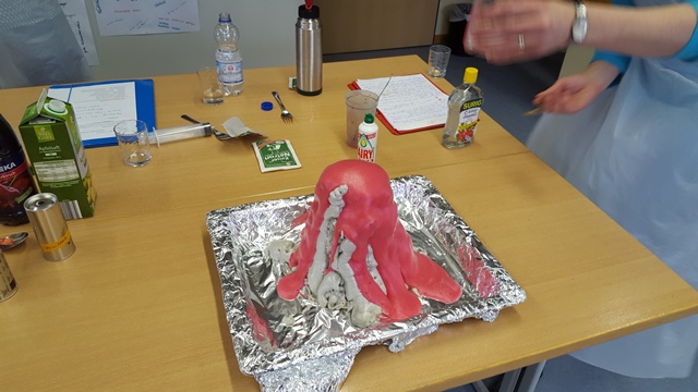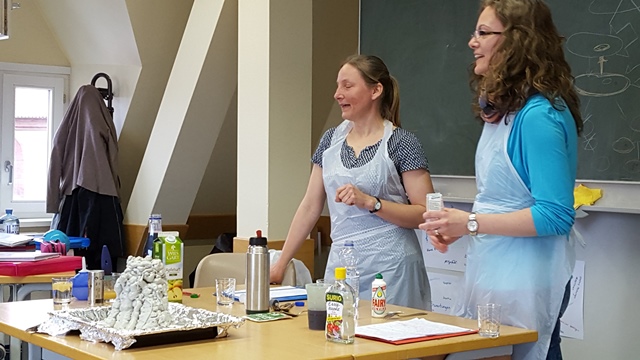 Nach einer kurzen Einführung in die Welt der über 300 gelisteten Zusatzstoffe war ihre Präsentation sehr praktisch angelegt. So wurde den Mitschülern in kleinen Experimenten eindrucksvoll gezeigt, zu welchen Ergebnissen der Einsatz von Lebensmittel-Zusatzstoffen führen kann. Mit Hilfe von Natriumalginat und Calciumchlorid wurden Apfelsaftkugeln hergestellt. Der eigens angefertigte Bauschaumvulkan „Schaum mer mal“ brach beim Befüllen mit einem Gemisch aus Rote Beete Saft und Natriumhydrogencarbonat – wie geplant – aus.