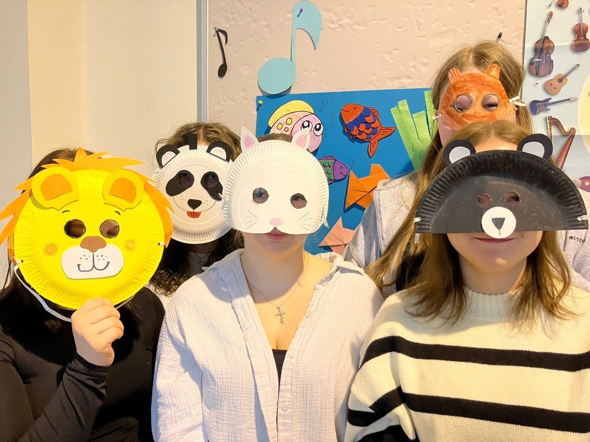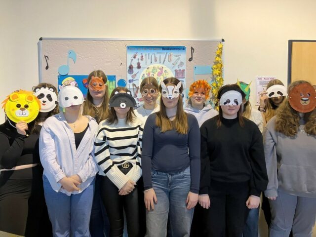 Im „Karneval der Tiere“, werden in 14 kurzen Stücken jeweils verschiedene Tiere musikalisch dargestellt. Der Komponist überlegte dabei immer, wie er mit einem großen Orchester Stimmen und Geräusche der Tiere nachahmen könnte. Herausgekommen ist dabei ein großes Meisterwerk, was uns sehr inspiriert hat. Durch die Musik konnten wir die Schönheit, Vielfalt und Einzigartigkeit der Tierwelt erkennen und wir wurden daran erinnert, wie reich und wunderbar unsere Natur ist. Es war für uns spannend zu raten, welches Tier gerade dargestellt wurde. Ausgehend davon gestaltete jeder von uns eine lustige Tiermaske…