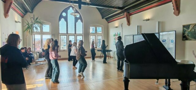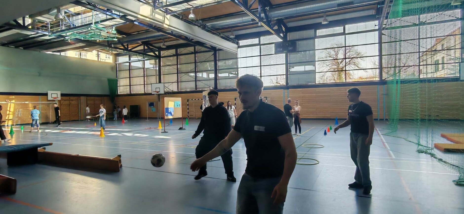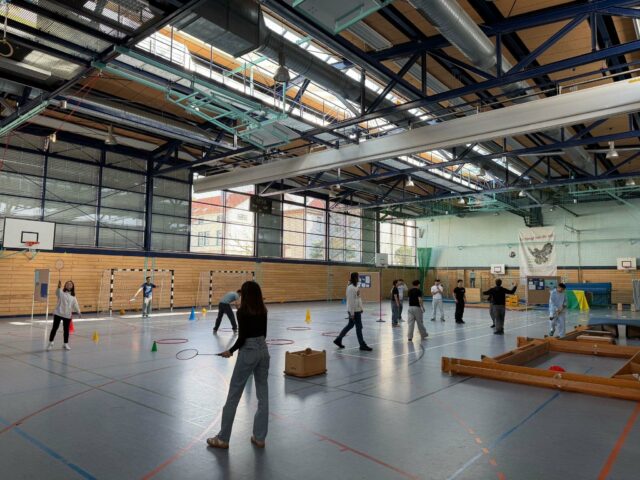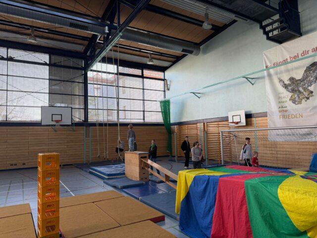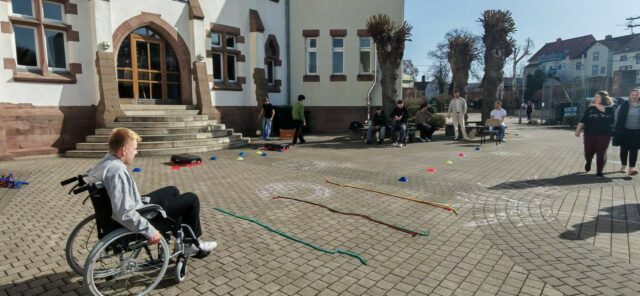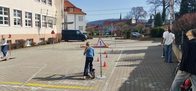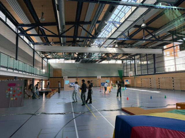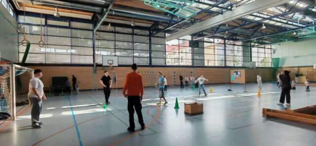 Ein großer Teil des Programms entstand im Rahmen der Projektwoche und sorgte für viele Mitmachangebote: In der Turnhalle warteten Kletterparcours, verschiedene Ballsportarten und sogar Minigolf. Auf dem Schulhof konnten Besucherinnen und Besucher bei einem besonderen Parcours erleben, wie es ist, sich mit Hilfsmitteln wie Roller, Rollator oder Rollstuhl fortzubewegen – eine Idee der Projektgruppe „Barrierefreiheit und Leben mit Einschränkungen„.