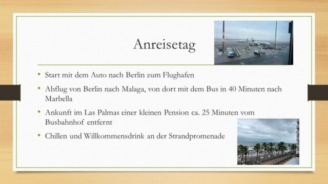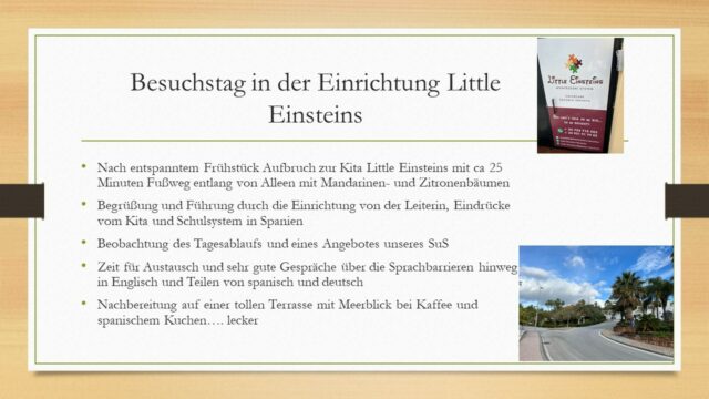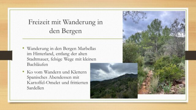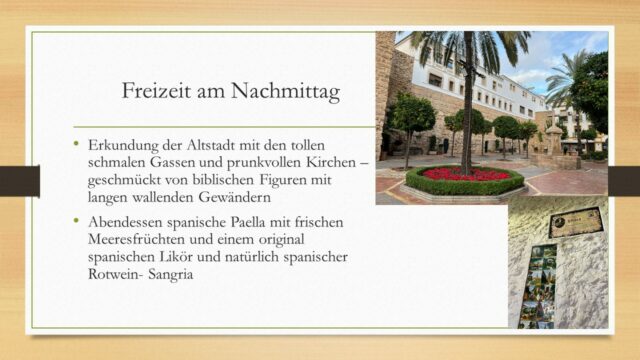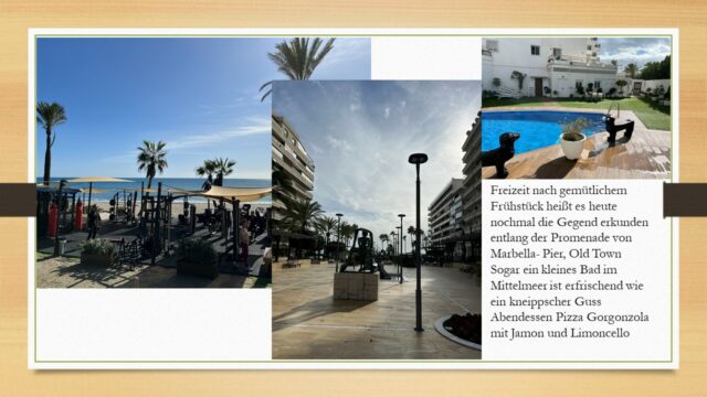 Schönes Wetter und spannende Einblicke in den Berufsalltag: Beim Praktikumsbesuch in Marbella konnte unsere Kollegin Fr. Simon hautnah erleben, wie unsere Schülerinnen und Schüler ihr Auslandspraktikum meistern. Zwischen mediterranem Flair und neuen beruflichen Erfahrungen zeigte sich einmal mehr, wie wertvoll solche internationalen Lernorte sind. Welche Eindrücke sie aus Marbella mitgebracht hat, lesen Sie in ihrem Reisetagebuch.